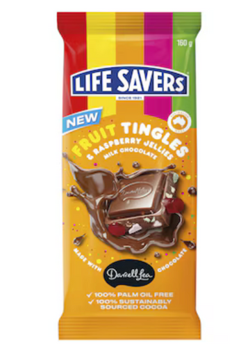 Life Savers takes chocolate to the next level with this wild and wonderful combo! Creamy milk chocolate meets fizzy Fruit Tingle candy pieces and chewy raspberry jellies for a sweet, tangy, and totally tingly surprise in every bite. It’s smooth, zesty, and bursting with Aussie nostalgia—like a party in your mouth where everyone brought snacks!